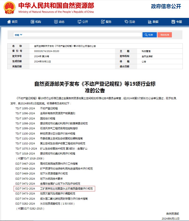 近日,中国地质调查局南京地质调查中心流域资源与环境演化研究团队牵头起草的《工矿废弃地土地复垦水土环境质量调查评价规范》(DZ/T 0472-2024)由自然资源部正式批准发布。