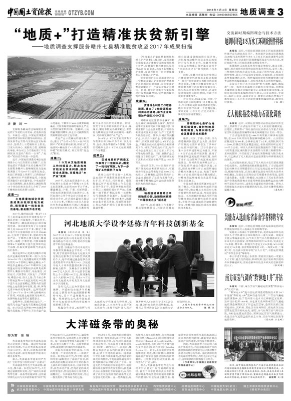 支撑服务赣南苏区精准脱贫是地质工作者的历史使命,更是政治担当。本着这一理念,中国地质调查局坚持需求导向和问题导向相结合,坚持发挥专业优势与贫困地区实际相结合,坚持点上示范辐射面上脱贫,以更大的决心、更强的力度、更精准的举措,举全局之力打通地质工作支撑脱贫攻坚的“最后一公里”,“地质+”的扶贫作用进一步显现。