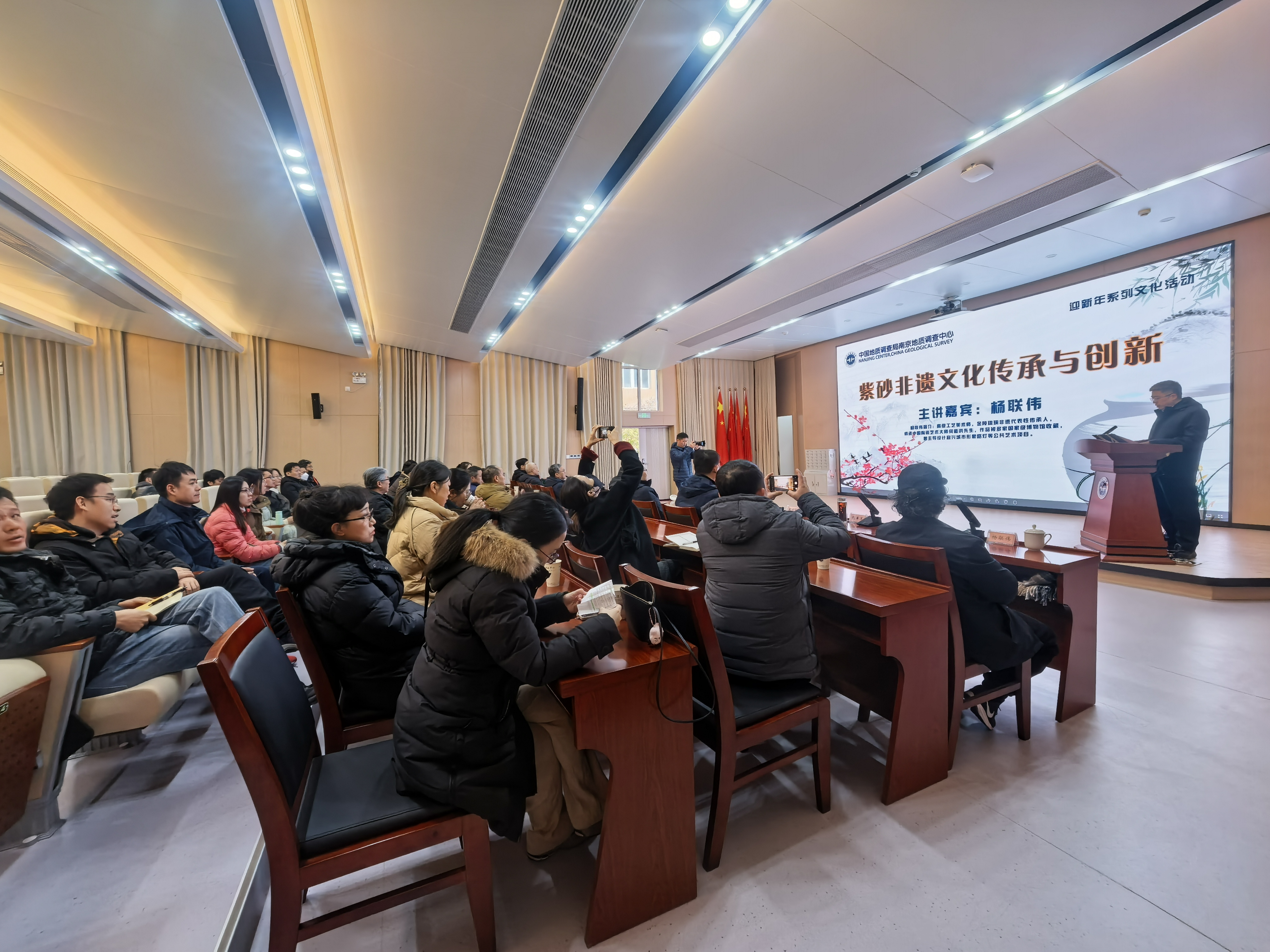 2026年1月5日上午,中国地质调查局南京地质调查中心学术报告厅内氛围浓厚,一场题为“紫砂非遗文化传承与创新”的专题讲座在此成功举办。本次活动特邀高级工艺美术师、南京工艺美术大师杨联伟主讲,聚焦地质资源与非物质文化遗产的跨界融合,吸引了江苏省自然资源厅、国家自然资源督察南京局、中国科学院南京地质古生物研究所等单位的陶瓷艺术爱好者及地质科研工作者参与,南京地调中心领导、副总及部分职工一同聆听。
