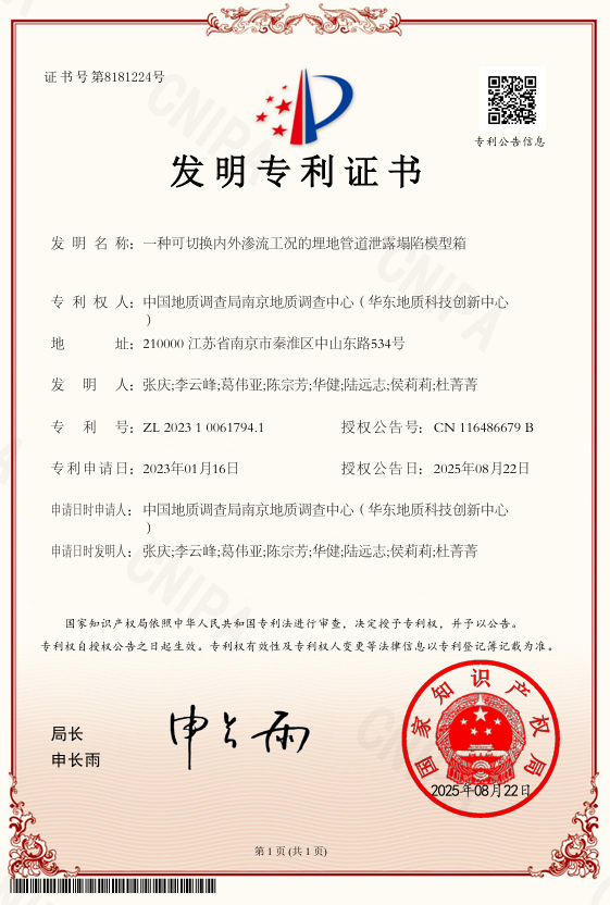 近日,南京地调中心研发的“一种可切换内外渗流工况的埋地管道泄露塌陷模型箱”获国家发明专利授权。该发明装置构建了渗流场—应力场—温度场多场可控的三维物理模型实验系统,用于开展水土耦合仿真模拟实验,包括塌陷、降水及热交换等场景,可以实时监测渗流、应力、温度、振动及变形等参数,刻画结构复杂地层多尺度水-力-温多场耦合效应,揭示水-土性能变异机理,在城市地质灾害防治、地下空间安全防护、地热能设计研究等领域具有良好的应用前景。